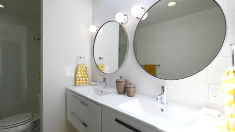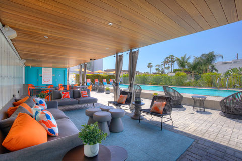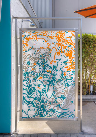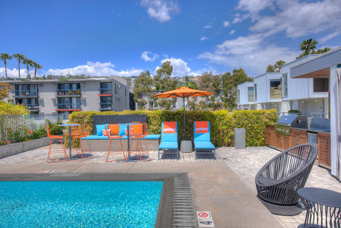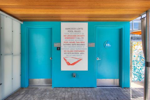 With a giant circular swing as a focal point, the Pool Lounge was designed as a party-ready space, with lots of places for tenants and their guests to eat, lounge and lay out. We added an outdoor kitchen, renovated the bathroom, and installed an outdoor shower screen and signage designed for the project by artist B-Luv.