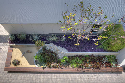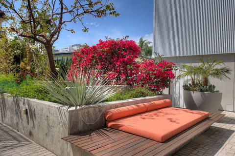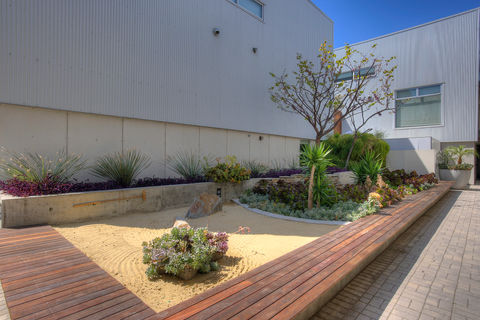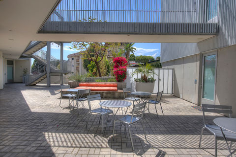 An open interior courtyard already included beautiful landscaping and connected the lofts, but lacked definition as a community space. We leaned into the idea of a Plaza, with a few cafe tables that invited lingering over coffee, a giant daybed that invited lounging, and a Zen garden that invited meditative raking.